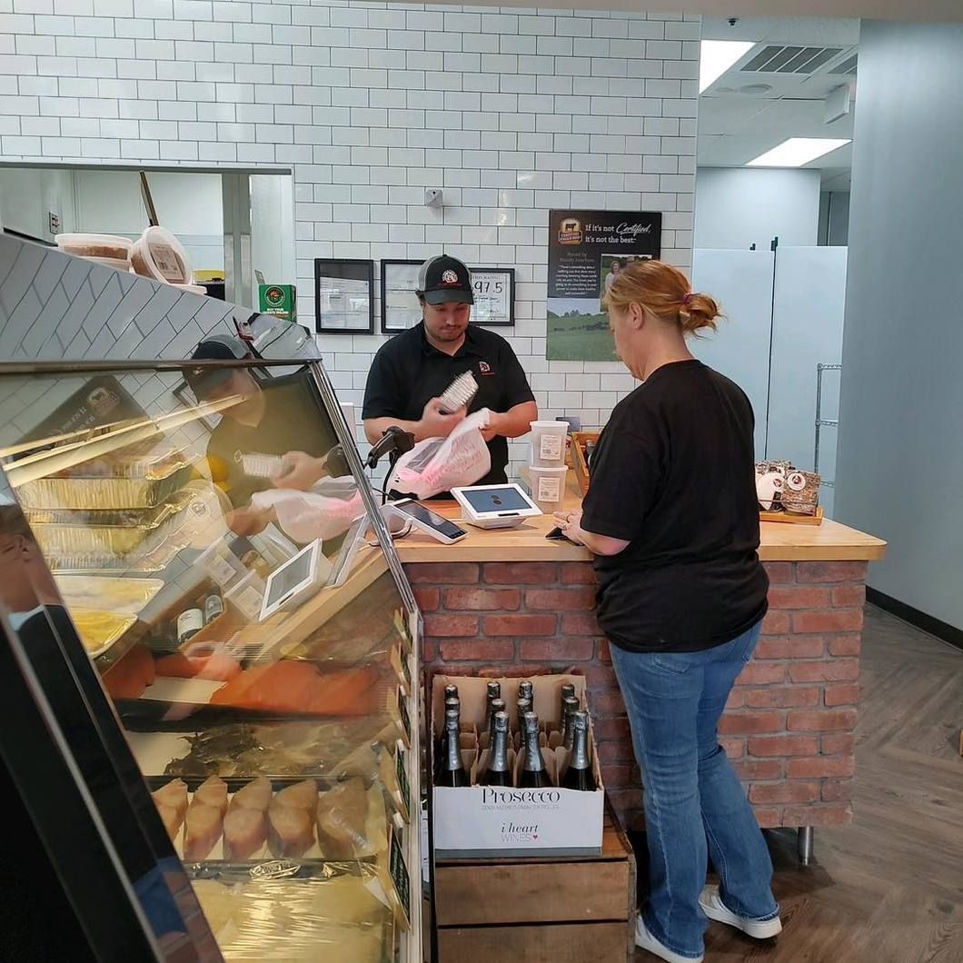 Our shop sells Certified Angus Beef® High Choice and Prime. It’s the only beef certified to always be juicy and delicious, brought to you by family farmers and ranchers. We also carry Heritage Breed Pork along with Natural, Pastured Raised, Hormone/Antibiotic Free Chickens. We make all our sausages in-house and have a rotating selection of fresh seafood available, including house-made crab cakes!