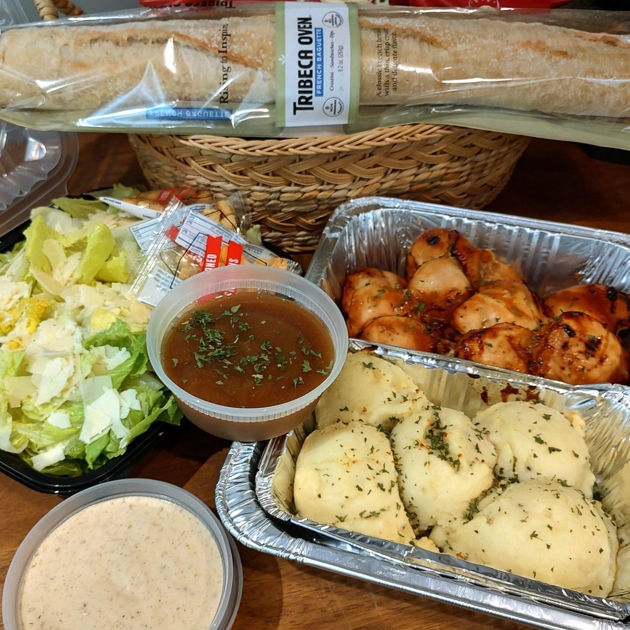 - Thursday: Hot Meal Family Size Marinated Chicken Breasts (choice of Teriyaki or Vidalia Onion) with Mashed Potatoes, a Caesar Salad, and a Baguette for $36.99. Serves 3-4. Call by 2:00 pm for Pickup after 5:00!