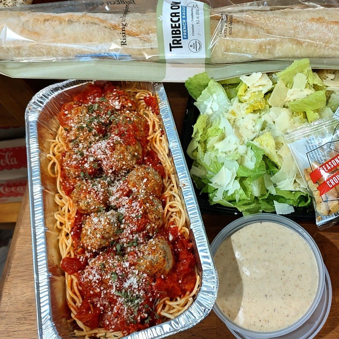 - Monday: Hot Meal Family Size Spaghetti and Meatballs with a Caesar Salad and Baguette for $34.99. Serves 3-4. Call by 2:00 pm for Pickup after 5:00!